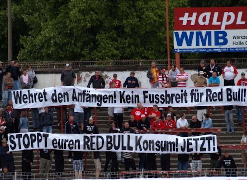 Dès l’annonce du projet RB Leipzig, les banderoles anti-Red Bull ont fleuri dans tous les stades allemands. Aujourd’hui, les choses se sont un peu calmées, mais on a encore vu des slogans hostiles au RB Leipzig lors d’un récent Dortmund – Hoffenheim. Et le mouvement de protestation ne manquera pas de repartir de plus belle lorsque le club est-allemand investira la 2.Liga et la Bundesliga…